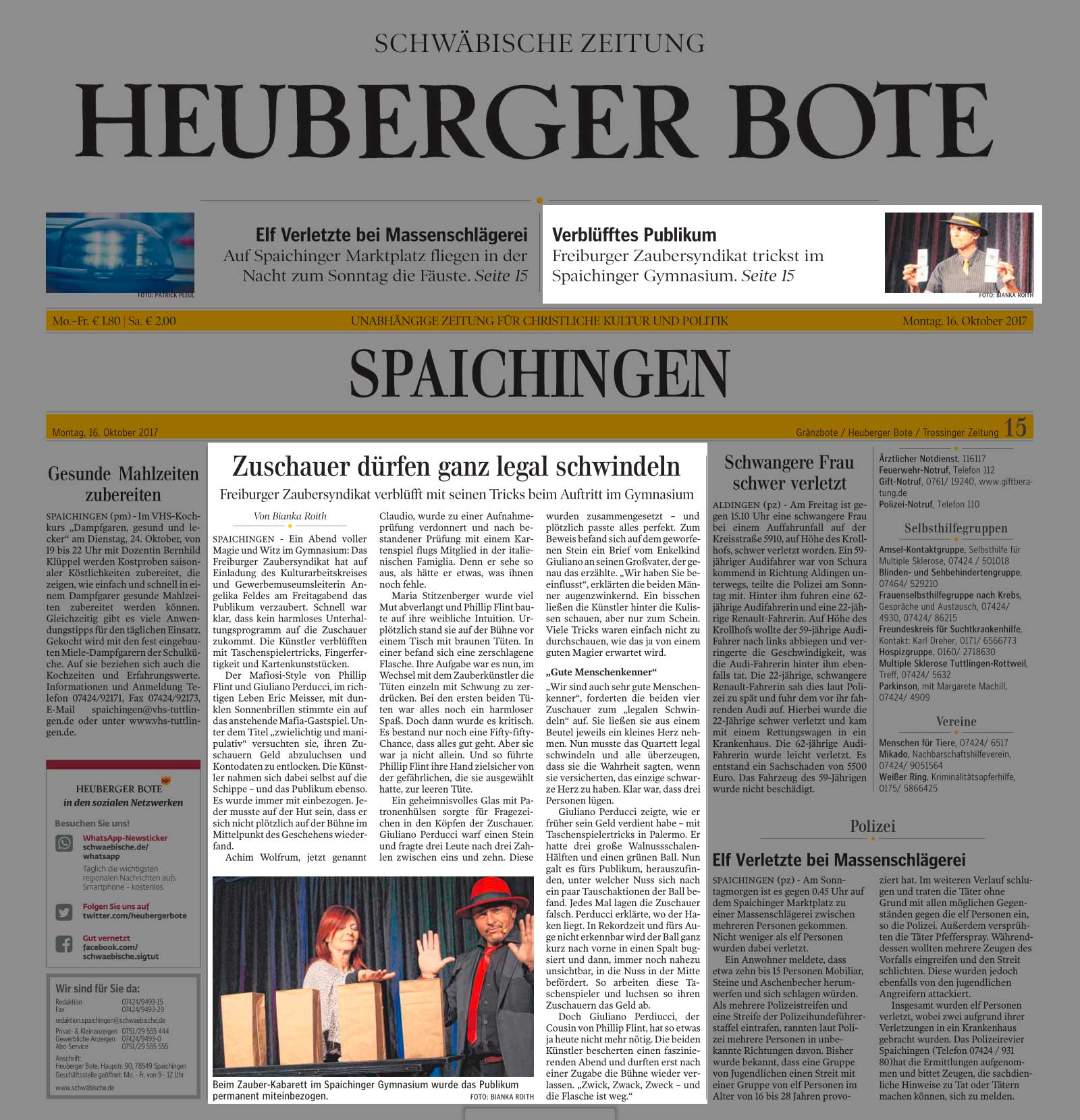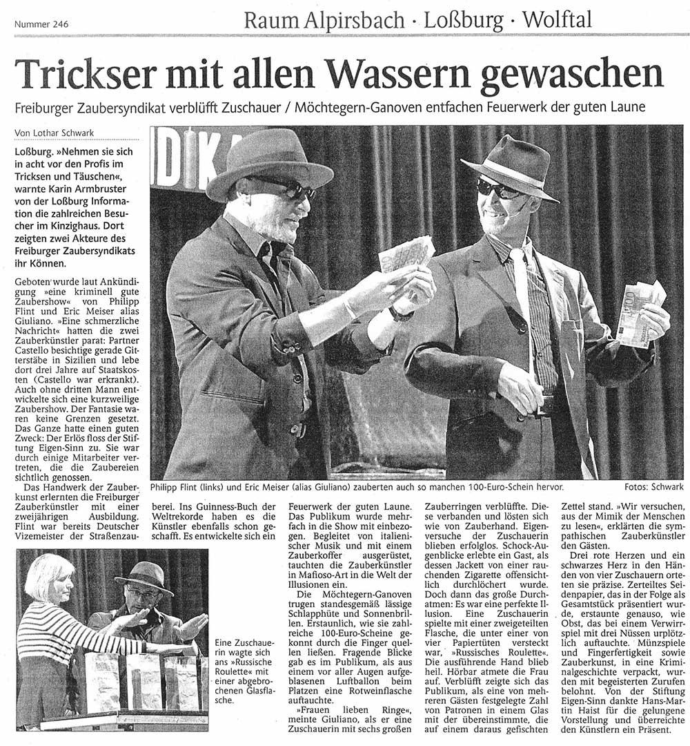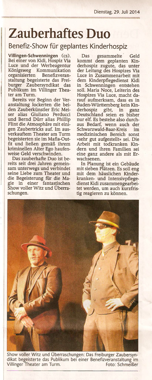 29.07.2014 Schwarzwälder-Bote: ".... begeisterten Sie im Mafia-Outfit.... in einer fantastischen Show voller Witz und Überraschungen"